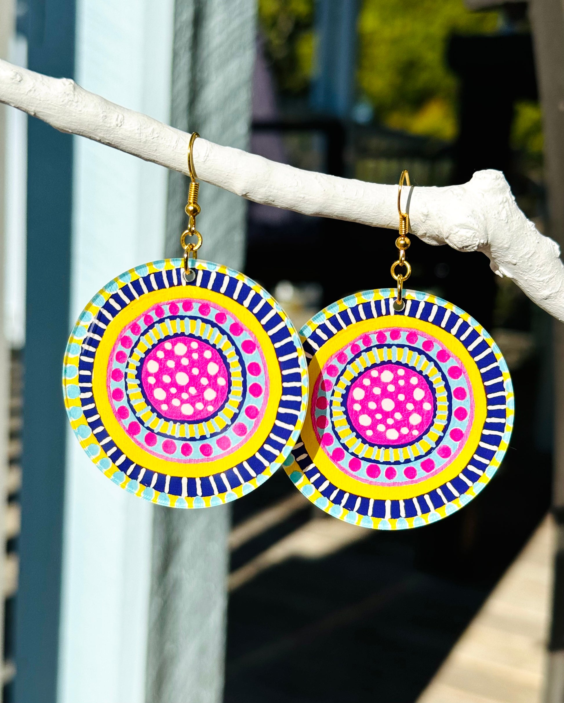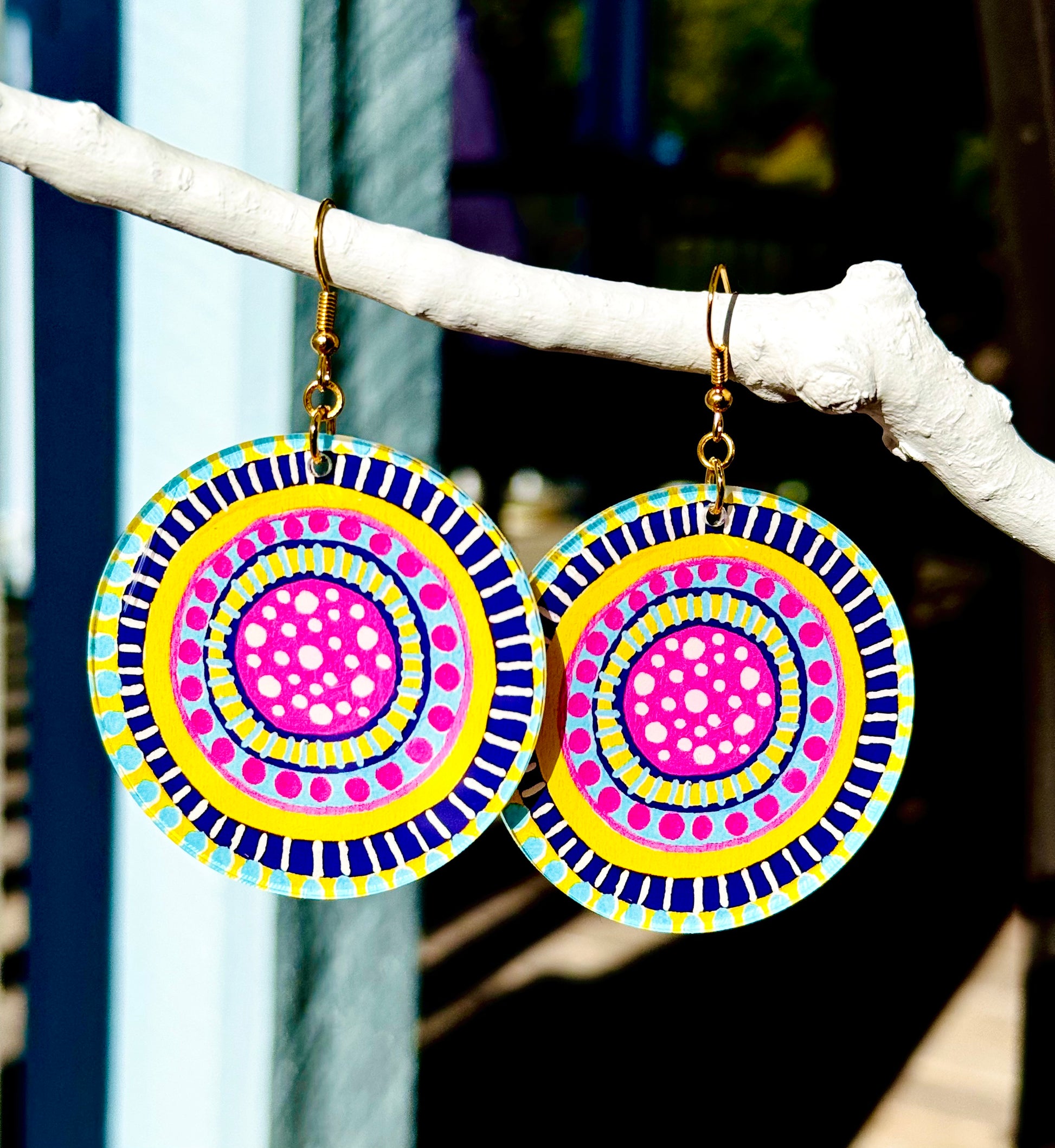 Contemporary Indigenous Acrylic earrings with a maximalist twist.