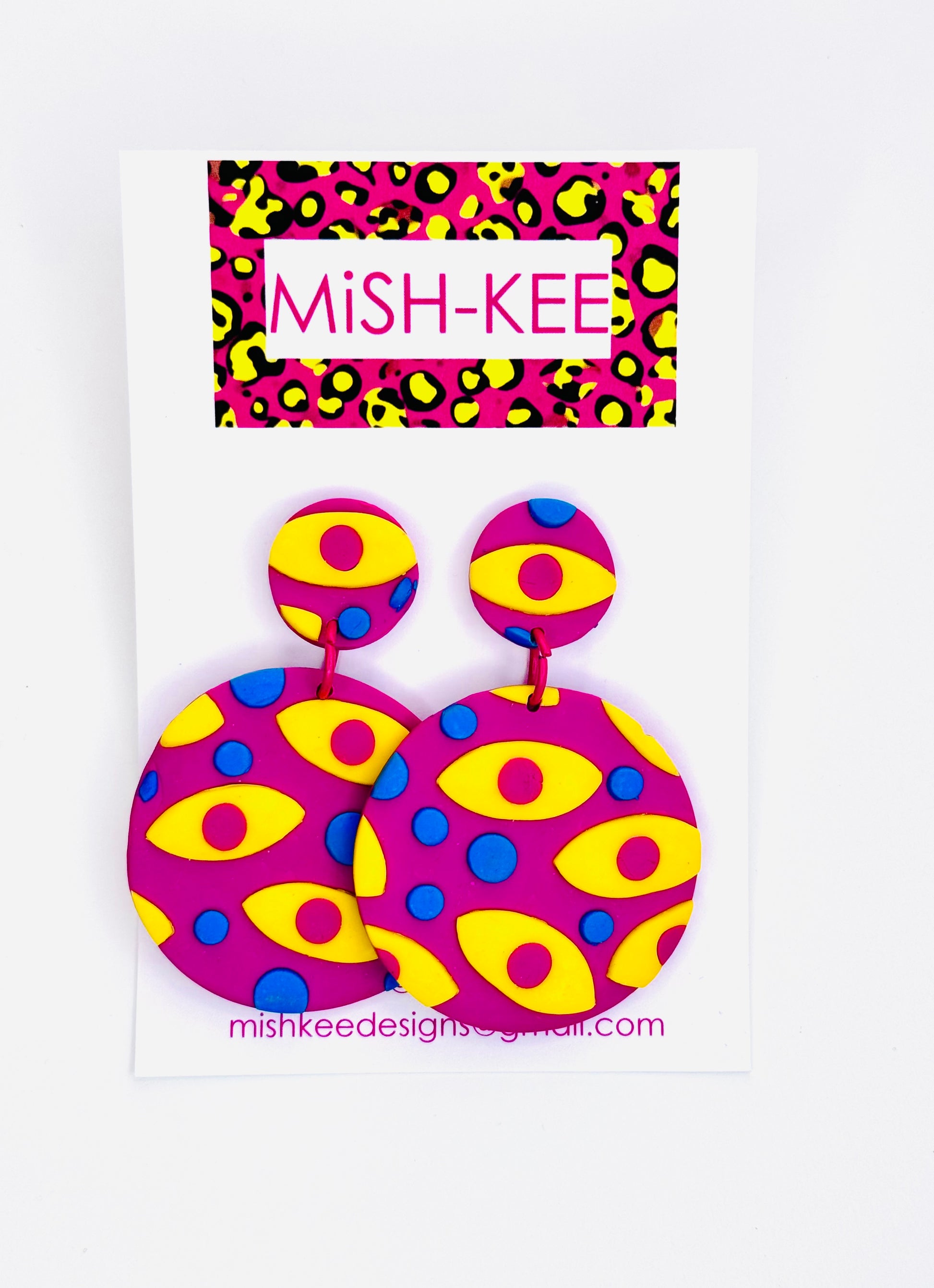 Bright and bold maximalist round earrings inspired by Yayoi Kusama's eyes in Magenta with yellow eyes and blue dots