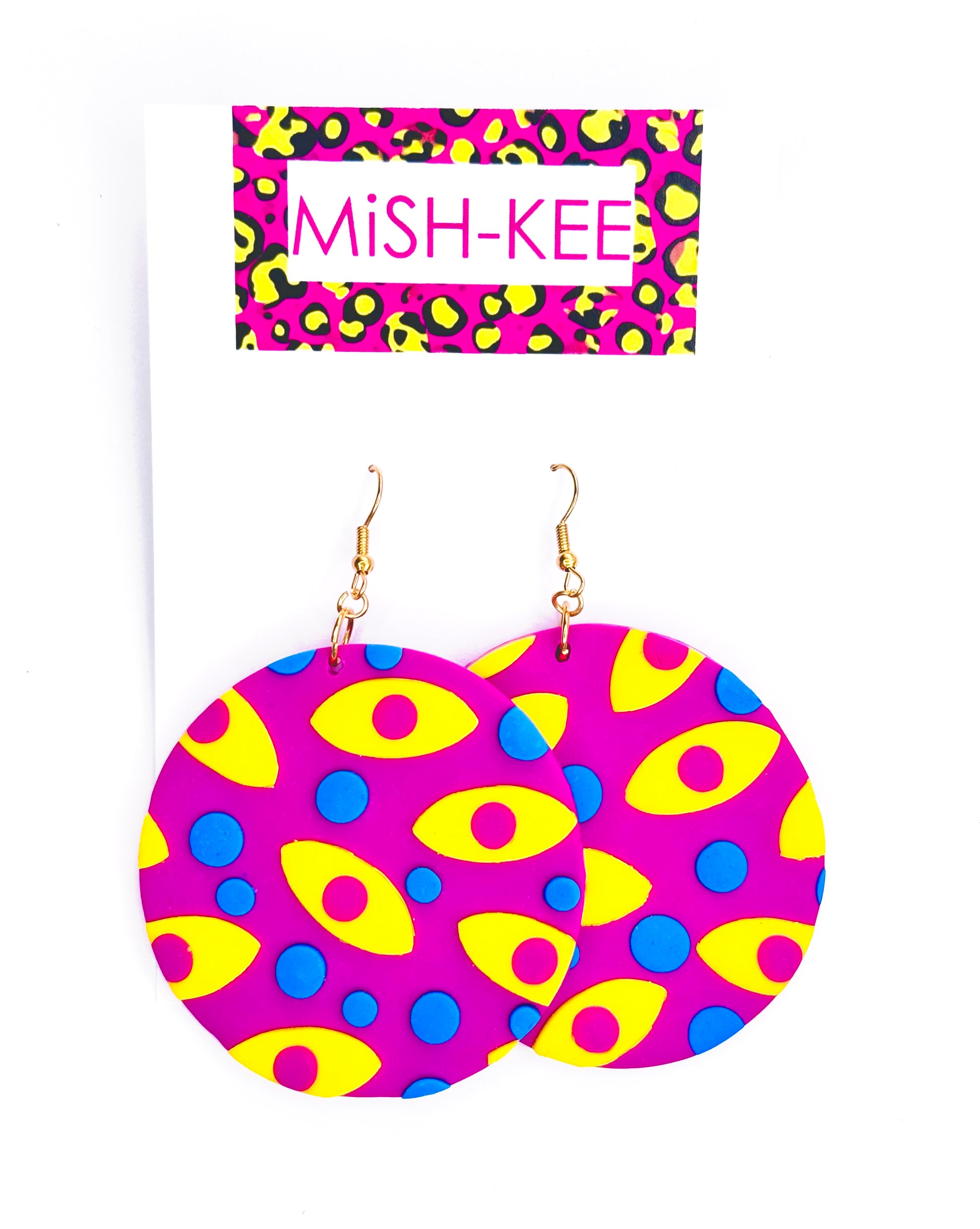Bright and bold maximalist round earrings inspired by Yayoi Kusama's eyes in Magenta with yellow eyes and blue dots