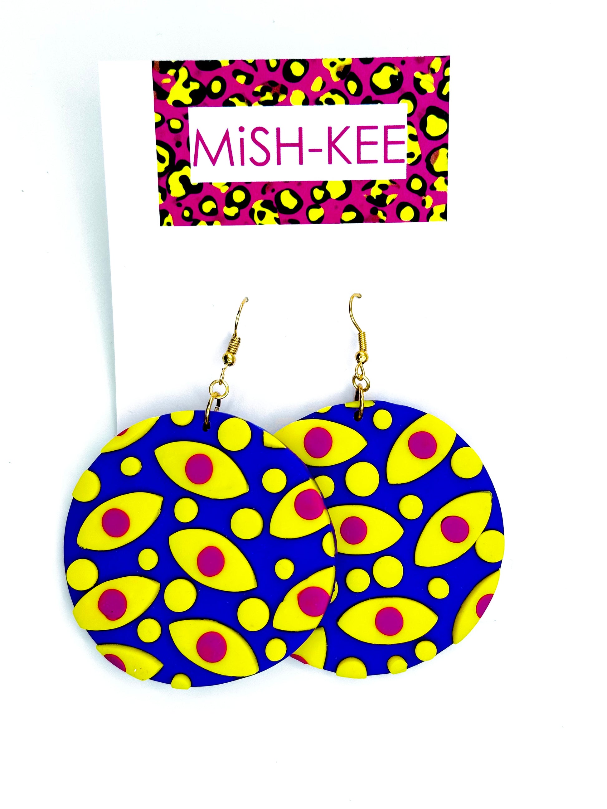Bright and bold maximalist round earrings inspired by Yayoi Kusama's eyes in Purple with yellow eyes and yellow dots. Approximately 8.5cm Length