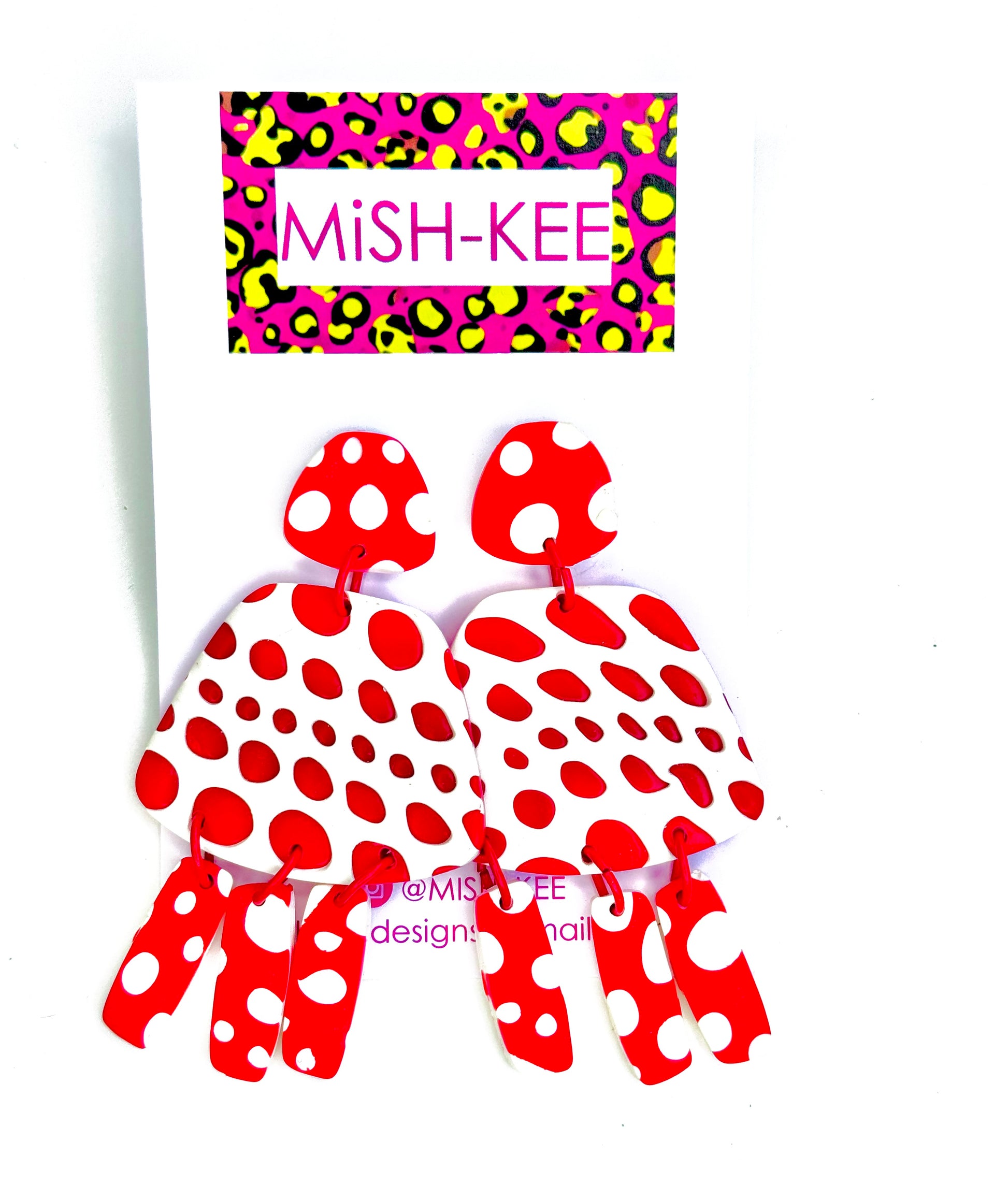Bright and bold maximalist Infinity style Yayoi Kusama inspired earrings in Red and White. Approximately 9cms length.